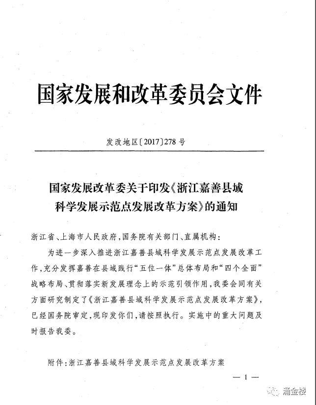 2017年2月16日,國家發(fā)展改革委關(guān)于印發(fā)《浙江嘉善縣域科學(xué)發(fā)展示范點發(fā)展改革方案》的通知。 ( 記者 張超 劉樂平)
