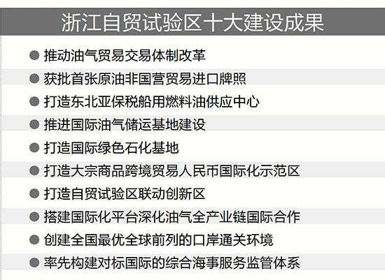 十大成果包括“推動油氣貿(mào)易交易體制改革”“獲批首張原油非國營貿(mào)易進口牌照”“打造東北亞保稅船用燃料油供應中心”等。這些成果可謂含金量十足,以“推動油氣貿(mào)易交易體制改革”為例,浙江自貿(mào)試驗區(qū)率先實現(xiàn)了保稅油經(jīng)營領域全面開放,躍升為全國第一、全球第八大加油港。